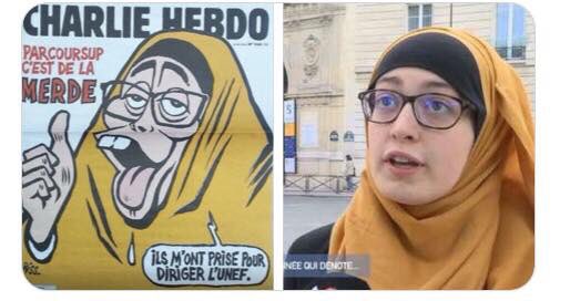 ম্যাগাজিনটির প্রকাশিত কার্টুনে দেখানো হয়, একটি বানর হিজাব পরে আছে। তার পাশে ক্যাপশনে লিখা ‘তারা আমাকে ‘ফ্রান্স ন্যাশনাল স্টুডেন্ট ইউনিয়ন-ইউএনইএফ’ এর প্রধান হিসেবে নির্বাচিত করেছে।