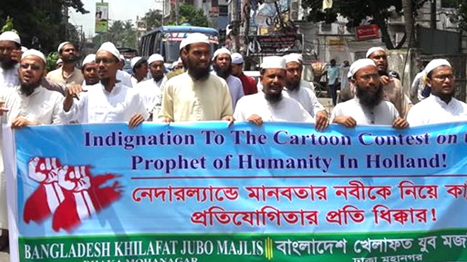 আওয়ার ইসলাম: নেদারল্যান্ডের ইসলামবিদ্বেষী এমপি কর্তৃক মানবতার নবি হযরত মুহাম্মাদ সাল্লাল্লাহু আলাইহি ওয়াসাল্লামের অবমাননাকর কার্টুন প্রতিযোগিতার উদ্যোগের বিরুদ্ধে ধিক্কার ও নিন্দা জানিয়ে বিক্ষোভ মিছিল করেছে বংলাদেশ খেলাফত যুব মজলিস ঢাকা মহানগর।