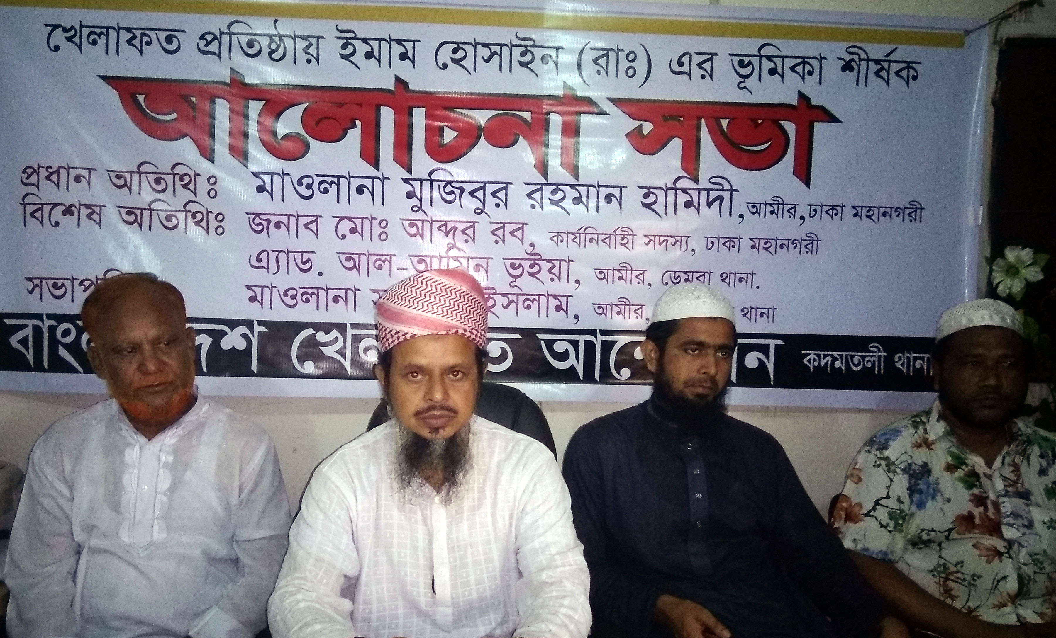 তাদেরকে প্রতিরোধে মুসলিম উম্মাহকে ঐক্যবদ্ধ হতে হবে। আজ বৃহস্পতিবার বিকালে খেলাফত আন্দোলন ঢাকা মহানগরীর কদমতলী থানা আয়োজিত খেলাফত প্রতিষ্ঠায় ইমাম হোসাইন (রাঃ) ভূমিকা শীর্ষক আলোচনা সভায় প্রধান অতিথির বক্তব্যে তিনি এসব কথা বলেন।