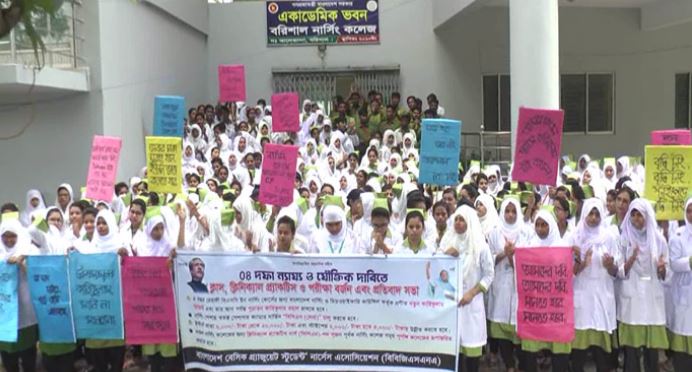 শনিবার (৬ জুলাই) শের-ই বাংলা মেডিকেল কলেজ ক্যাম্পাসের নার্সিং কলেজ চত্বরে ক্লাস পরীক্ষাসহ সব ধরনের কার্যক্রম বন্ধ রেখে এ বিক্ষোভ করেন তারা।