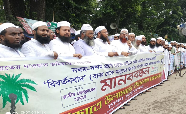 আওয়ার ইসলাম: জমিয়তে উলামায়ে ইসলাম বাংলাদেশ ঢাকা মহানগরীর উদ্যোগ রাজধানীর জাতীয় প্রেসক্লাবের সামনে ৩০ জুলাই (মঙ্গলবার) বেলা ১১ টায় নবম-দশমশ্রেণি থেকে মাস্টার্স পর্যন্ত ডারউইনের ইসলাম বিরোধী 'বিবর্তনবাদ' তত্ত্ব পাঠ্যপুস্তক থেকে প্রত্যাহরের দাবিতে মানববন্ধন অনুষ্ঠিত হয়েছে।
