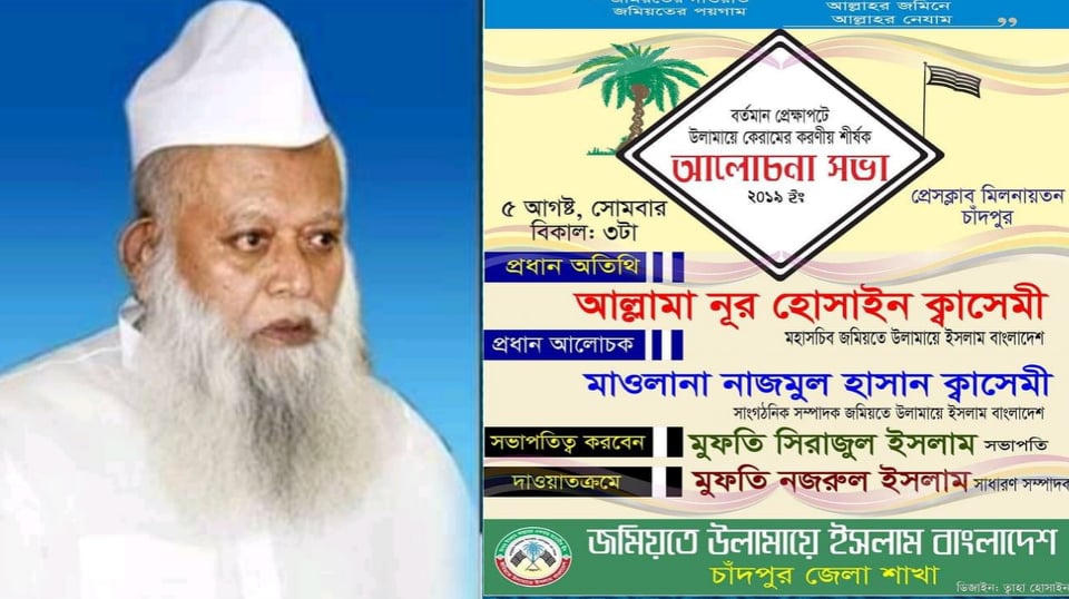 আওয়ার ইসলাম: জমিয়তে উলামায়ে ইসলাম বাংলাদেশ চাঁদপুর জেলার উদ্যোগে বর্তমান প্রেক্ষাপটে উলামায়ে কেরামের করণীয় শীর্ষক সেমিনারে প্রধান অতিথি হিসেবে উপস্থিত থাকবেন জমিয়ত মহাসচিব আল্লামা নূর হোসাইন কাসেমী।