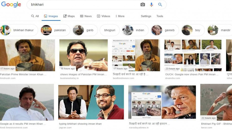 এর ব্যাখ্যা দিতে হয়েছে তাকে। সেসময় পাকিস্তানেরও অভিযোগ ছিল গুগলে ‘ভিখারি’ লিখে সার্চ দিলে ভেসে আসছে প্রধানমন্ত্রী ইমরান খানের ছবি। এবার আবারো গুগলে ইংরেজিতে ‘ভিখারি/bhikhari’ লিখে সার্চ করলে আসছে ইমরান খানের ছবি।