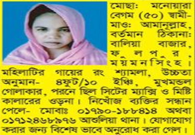 নিখোঁজ মনোয়ারা ময়মনসিংহ জেলার ফুলপুর থানার বেল্টিয়া বালিয়া গ্রামের মাওলানা আমান উল্লাহর স্ত্রী । স্বামী সন্তানের সাথে জামগড়া (মধ্যপাড়া), বাইপেল, আশুলিয়া, ঢাকায় এলাকায় থাকতেন মনোয়ারা ৷