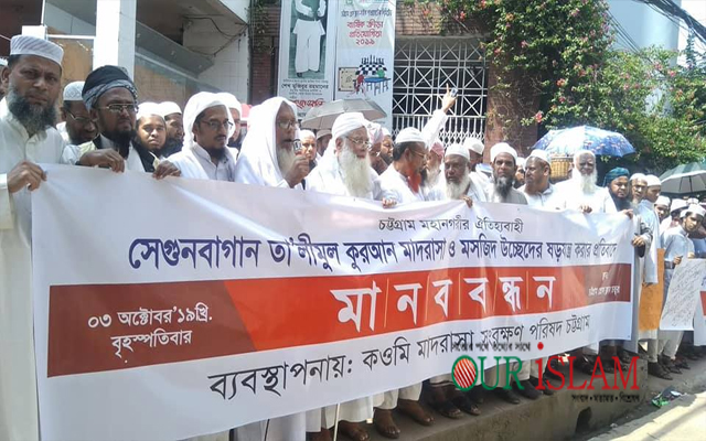 আওয়ার ইসলাম: চট্টগ্রামের খুলশী থানাধীন সেগুনবাগান তা’লীমুল কুরআন মাদরাসা ও মসজিদ উচ্ছেদ ষড়যন্ত্রের প্রতিবাদে কওমি মাদরাসা সংরক্ষণ পরিষদ চট্টগ্রাম মহানগরীর উদ্যোগে মানববন্ধন অনুষ্ঠিত হয়। বৃহস্পতিবার বেলা ১১ টায় চট্টগ্রাম প্রেসক্লাব চত্বরে মানববন্ধনটি আয়োজিত হয়।