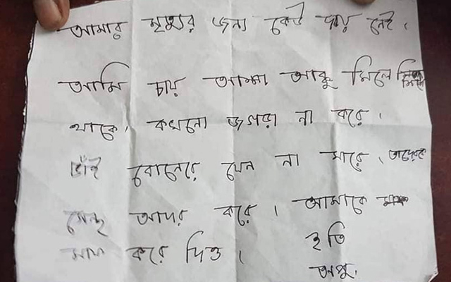 আওয়ার ইসলাম: ‘আমার মৃত্যুর জন্য দায়ী কেউ নন। আমি চাই আব্বু ও আম্মু মিলে মিশে থাকুক। কখনো ঝগড়া না করুক, ভাই বোনদের যেন না মারে। তাদের যেন আদর স্নেহ করুক। আমাকে মাফ করে দিও, ইতি অপু’। এসবই ছিল বিদায়বেলায় চিরকুটে লেখা অপুর শেষ আকুতি।