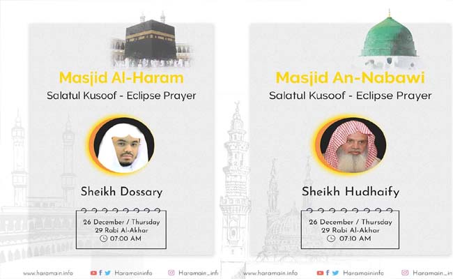 বৃহস্পতিবার সৌদি আরবে সূর্যগ্রহণ উপলক্ষ্যে দেশের প্রতিটি এলাকায় সরকারের পক্ষ থেকে সালাতুল কুসুফ তথা সূর্যগ্রহণের দুই রাকাত সুন্নত নামাজ আদায়ের আদেশ জারি করা হয়েছে।