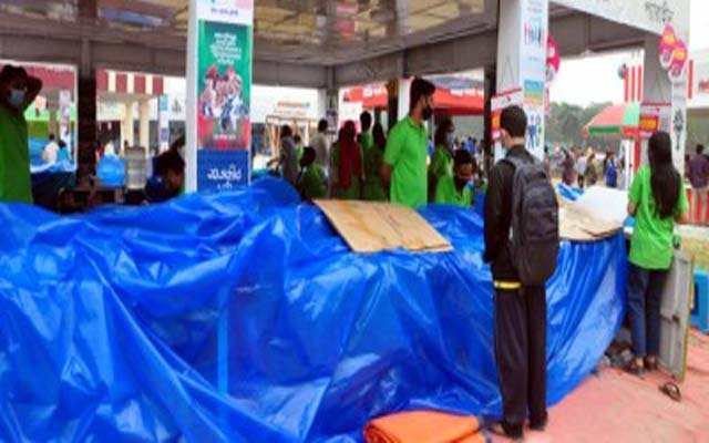 বিকেল ৫টা বাজার আগেই নামলো ঝমঝমিয়ে বৃষ্টি। ভিজে গেল বইমেলা।