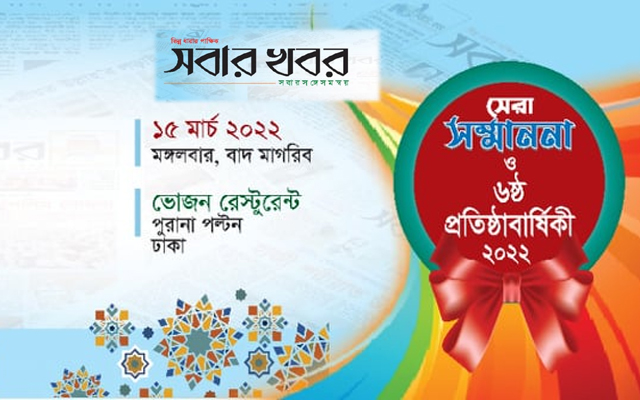 আজ মঙ্গলবার বাদ মাগরিব থেকে ৬ষ্ঠ পতিষ্ঠাবার্ষিকী উপলক্ষে সেরাদের সম্মাননা দিতে যাচ্ছে সবার খবর। ঢাকার পুরানা পল্টনের ভোজ রেস্টুরেন্টে আয়োজিত হচ্ছে এ সম্মাননা প্রদান অনুষ্ঠান। অনুষ্ঠানে থাকবেন দেশের প্রবীন আলেম লেখক ও সাংবাদিকগণ।