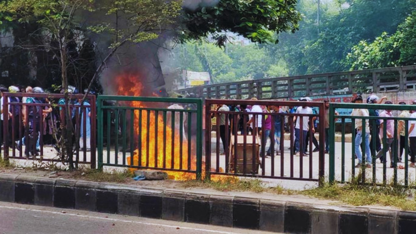 বৃহস্পতিবার (১৮ জুলাই) বেলা ১১টার পর পুলিশ বক্সে অগ্নিসংযোগ করা হয়। এ সময় শিক্ষার্থীরা ভাঙচুরও করেন।
