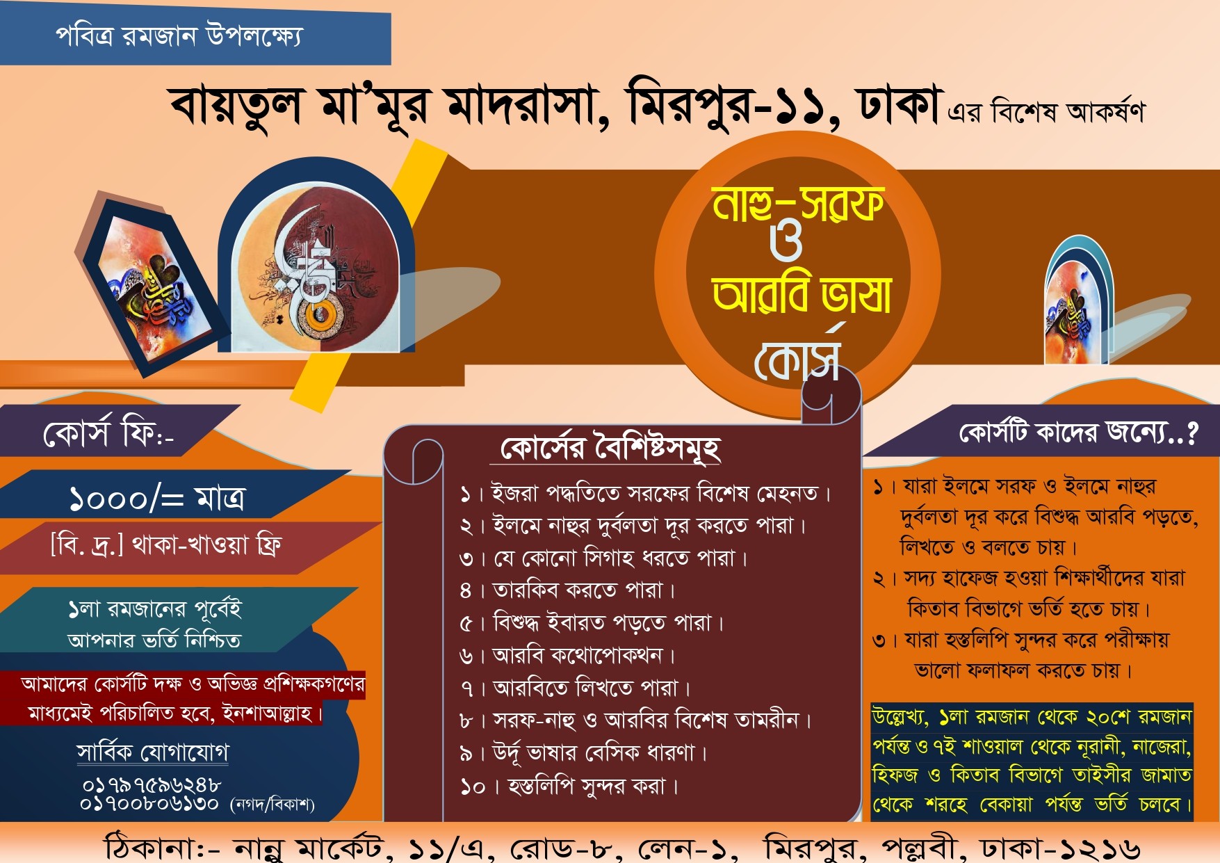 পবিত্র রমজানে মিরপুরে আরবি ভাষা ও নাহু-সরফ প্রশিক্ষণ কোর্সের আয়োজন করা হয়েছে। মিরপুর-১১ তে অবস্থিত বায়তুল মা'মূর মাদরাসার আয়োজনে এই কোর্সটির উদ্যোগ নেওয়া হয়েছে।