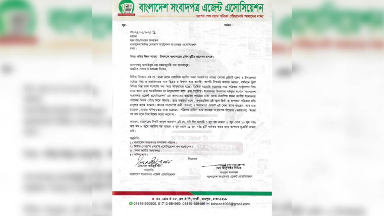এতে বলা হয়, ঢাকা থেকে প্রকাশিত জাতীয় সকল সংবাদপত্র আমরা দেশের প্রতিটি জেলা ও উপজেলায় সর্বোচ্চ নিষ্ঠা ও আন্তরিকতার সঙ্গে বিক্রয় ও বিপণন করে আসছি। আপনি নিশ্চয়ই অবগত আছেন, বর্তমানে প্রিন্ট মিডিয়া শিল্প চরম সংকটের মধ্য দিয়ে অতিবাহিত হচ্ছে।