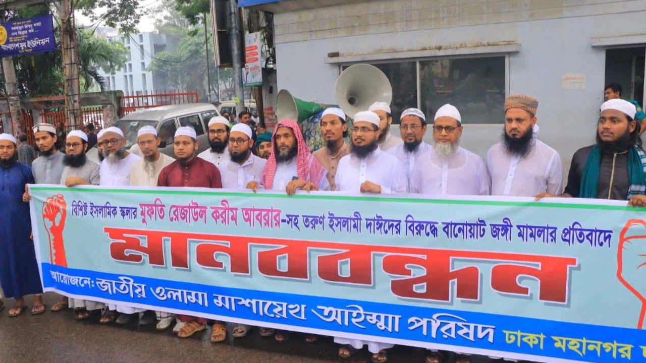 আজ বৃহস্পতিবার (১৭ জুলাই) দুপুর ১২টায় রাজধানীর একটি গুরুত্বপূর্ণ স্থানে এ মানববন্ধনের আয়োজন করা হয়। এতে সভাপতিত্ব করেন সংগঠনের ঢাকা মহানগর দক্ষিণের সভাপতি শাইখুল হাদীস হাফেজ মাওলানা ইউনুছ ঢালী এবং যৌথভাবে সঞ্চালনা করেন মুফতি রফিকুল ইসলাম আশরাফী ও মুফতি মঈনুদ্দীন খান তানভীর।