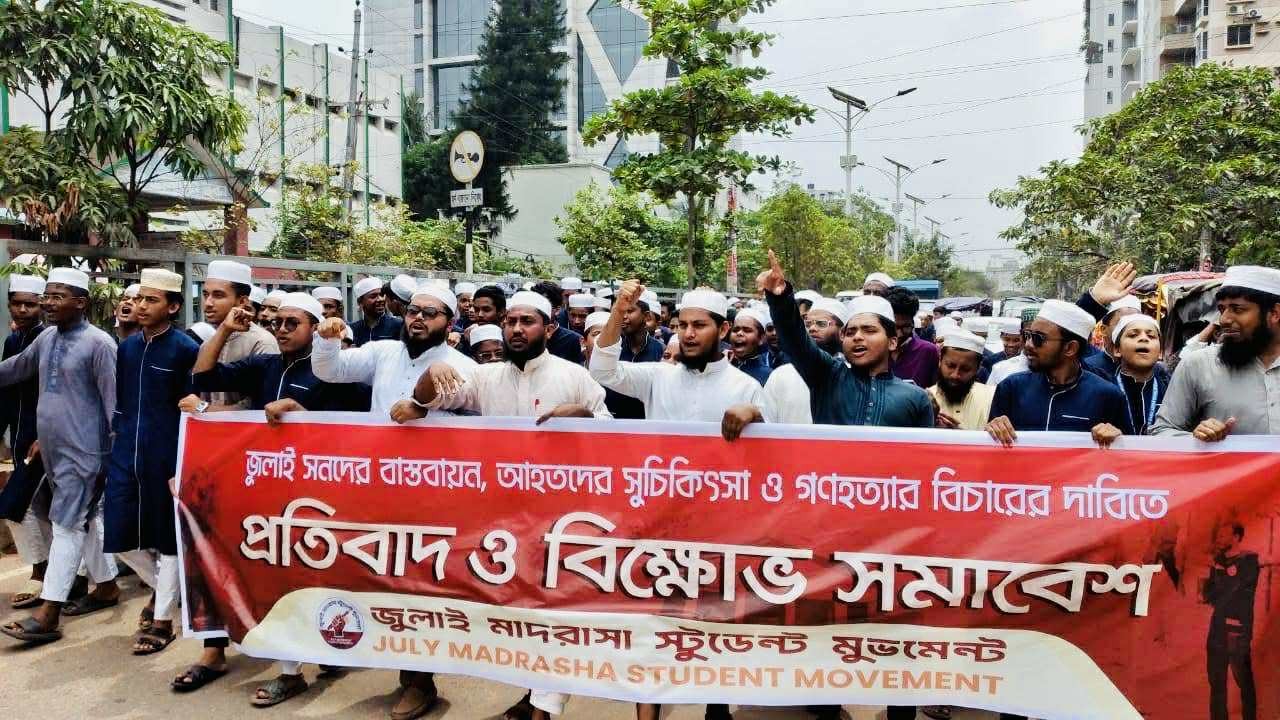 গণহত্যার দৃশ্যমান বিচারের দাবিতে রাজধানীর উত্তরায় প্রতিবাদ সমাবেশ ও বিক্ষোভ মিছিল করেছে “জুলাই মাদরাসা স্টুডেন্ট মুভমেন্ট”।