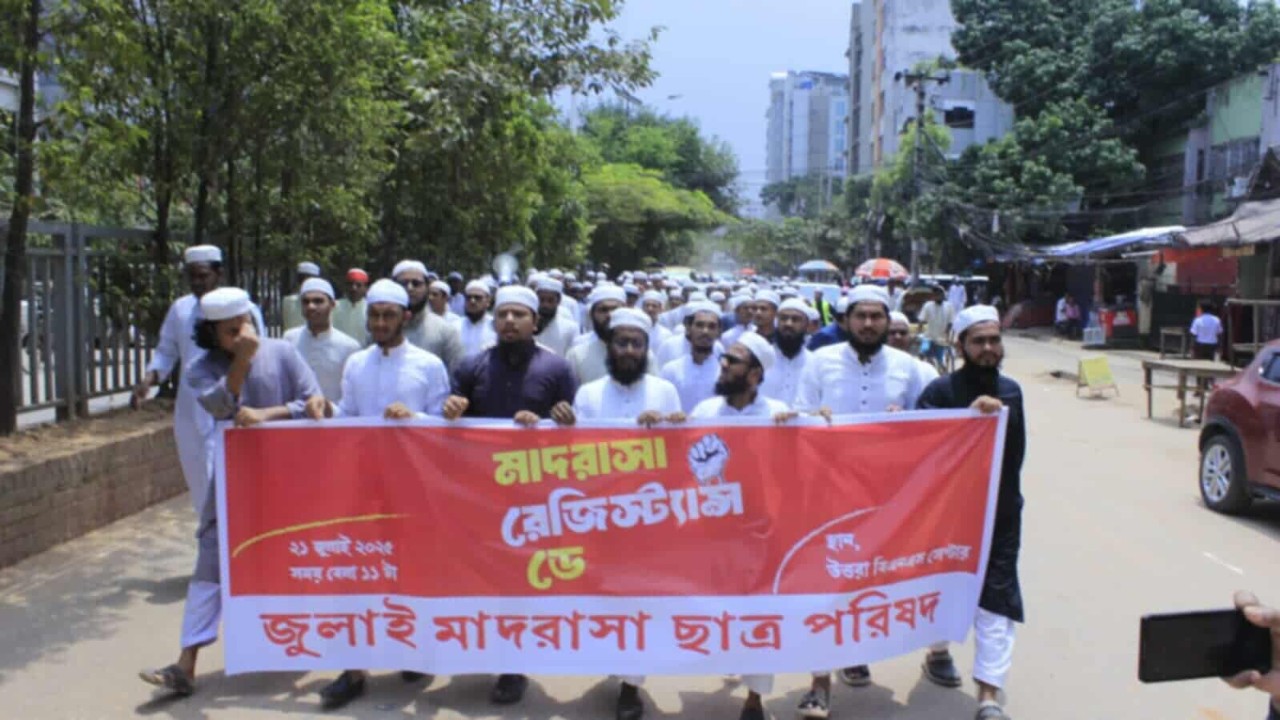 আজ ২১ জুলাই, ‘জুলাই মাদরাসা রেজিস্ট্যান্স দিবস’ উপলক্ষে রাজধানীর উত্তরা এলাকায় ব্যাপক বিক্ষোভ মিছিল ও প্রতিবাদ কর্মসূচি পালন করেছে “জুলাই মাদরাসা ছাত্র পরিষদ”। সকাল ১১টা থেকে উত্তরা বিএনএস সেন্টার প্রাঙ্গণে জড়ো হতে থাকে শত শত মাদরাসা শিক্ষার্থী। পরবর্তীতে তারা একটি শান্তিপূর্ণ বিক্ষোভ মিছিল নিয়ে উত্তরার বিভিন্ন সড়ক প্রদক্ষিণ করে।