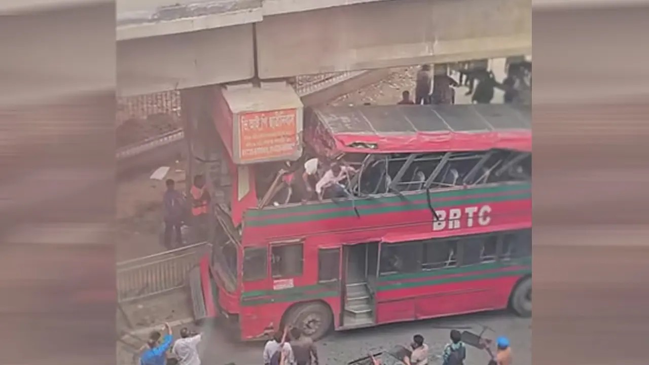প্রত্যক্ষদর্শীরা জানান, যাত্রী ওঠানো নিয়ে প্রতিযোগিতায় থাকা বিআরটিসির দুটি দোতলা বাসের একটি নিয়ন্ত্রণ হারিয়ে এক্সপ্রেসওয়ের পিলারে সজোরে ধাক্কা খায়। এতে বাসটির দোতলার ছাদ আংশিক বিধ্বস্ত হয়ে একপাশে ভেঙে পড়ে। ভয় পেয়ে জানালা দিয়ে লাফিয়ে নামেন যাত্রীরা।