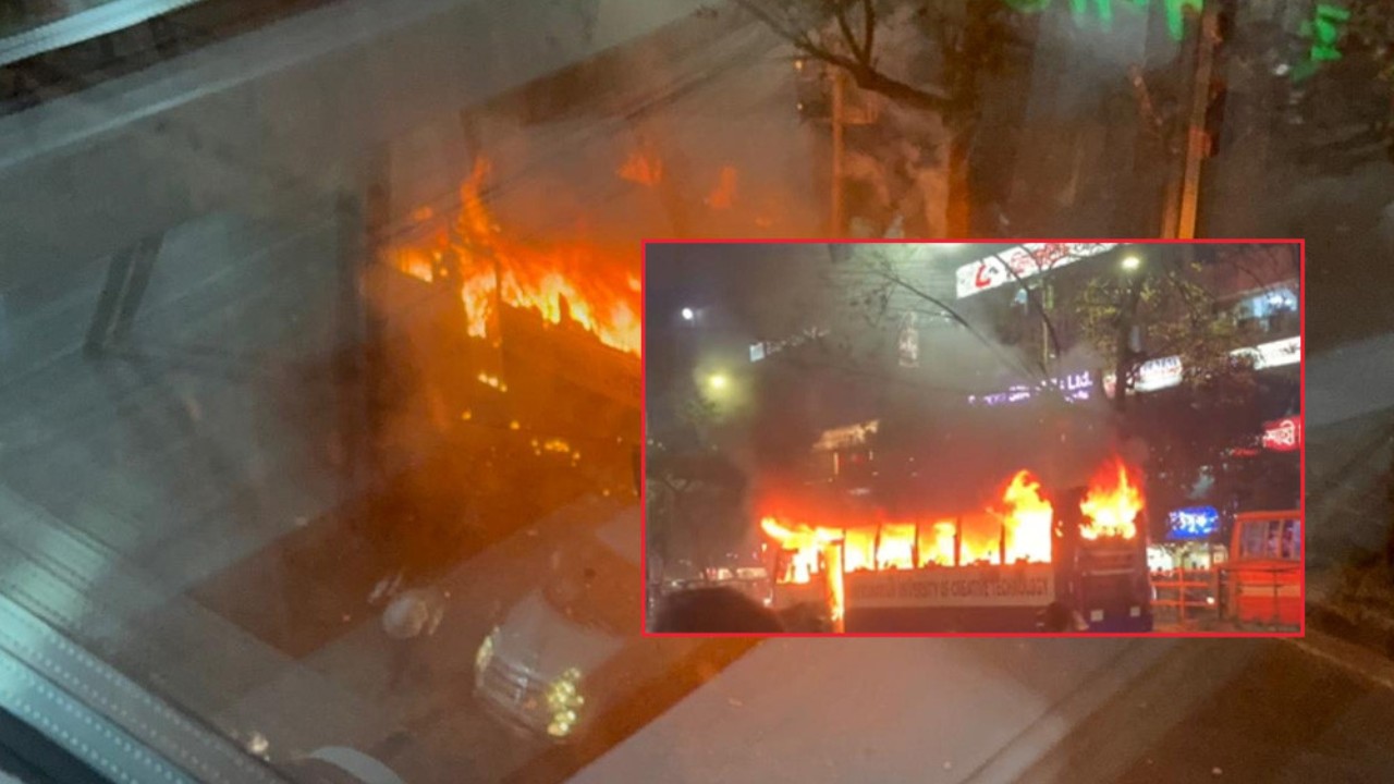 কিছুক্ষণ পরই বাসটিতে হঠাৎ আগুন ধরে যায়। এটি নাশকতা নাকি দুর্ঘটনা, তা নিশ্চিত করতে পারেনি কেউ।