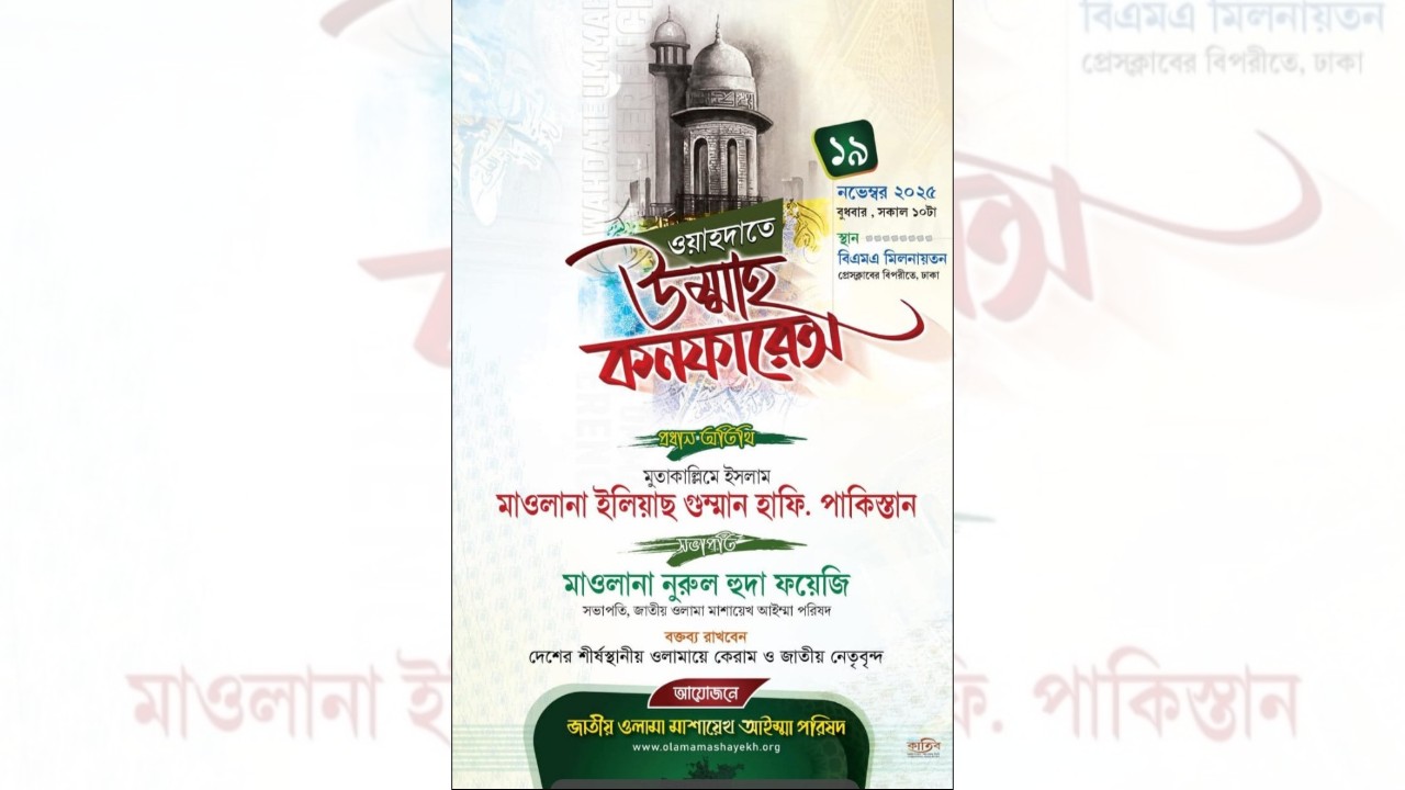 রাজধানী ঢাকায় আগামীকাল ১৯ নভেম্বর ২০২৫, বুধবার সকাল ১০টায়, জাতীয় প্রেসক্লাবের বিপরীতে বি এম মিলনায়তনে অনুষ্ঠিত হতে যাচ্ছে“ওয়াহদাতে উম্মাহ কনফারেন্স”।
