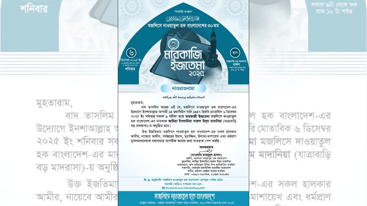 দাওয়াতনামায় বলা হয়- বাদ তাসলিম আরজ এই যে, মজলিসে দাওয়াতুল হক বাংলাদেশ-এর উদ্যোগে ইনশাআল্লাহ আগামী ১৪ জমাদিউস সানি ১৪৪৭ হিজরি মোতাবিক ৬ ডিসেম্বর ২০২৫ ইং শনিবার সকাল ৯ ঘটিকা হতে মারকাজী ইজতেমা মজলিসে দাওয়াতুল হক বাংলাদেশ-এর মারকাজ জামিয়া ইসলামিয়া দারুল উলূম মাদানিয়া (যাত্রাবাড়ি বড় মাদরাসা)-য় অনুষ্ঠিত হবে।