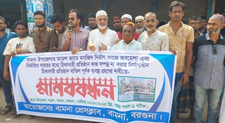বামনায় মডেল মসজিদের নির্মাণ দেরিতে, ক্ষুব্ধ জনতার মানববন্ধন