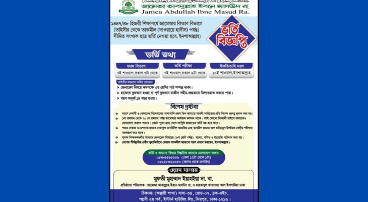 তাইসির থেকে তাকমিল পর্যন্ত ভর্তি নিচ্ছে জামেআ আবদুল্লাহ ইবনে মাসউদ রা.