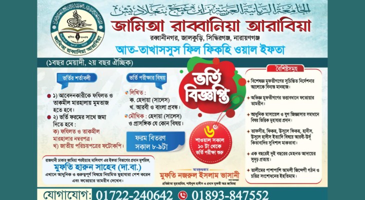 ঈর্ষণীয় সাফল্য অর্জনকারী জামিআ রাব্বানিয়ায় ভর্তি তারিখ ঘোষণা