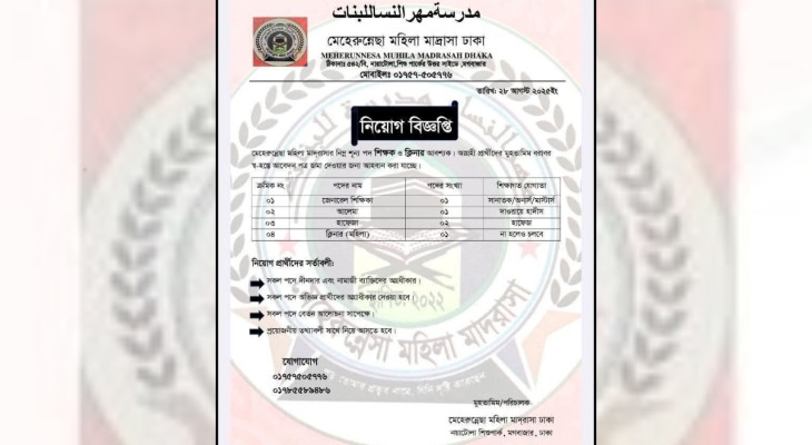 মেহেরুন্নেছা মহিলা মাদরাসার নিয়োগ বিজ্ঞপ্তি প্রকাশ
