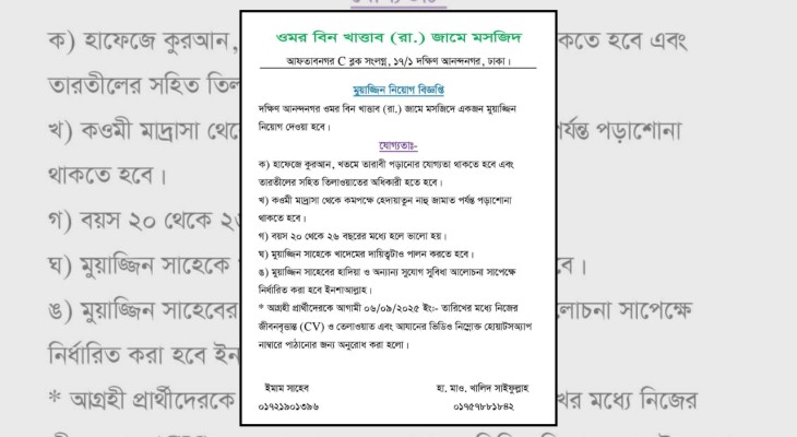 বাইতুস সালাম মসজিদ মাদরাসা কমপ্লেক্স -এ মুয়াজ্জিন নিয়োগ