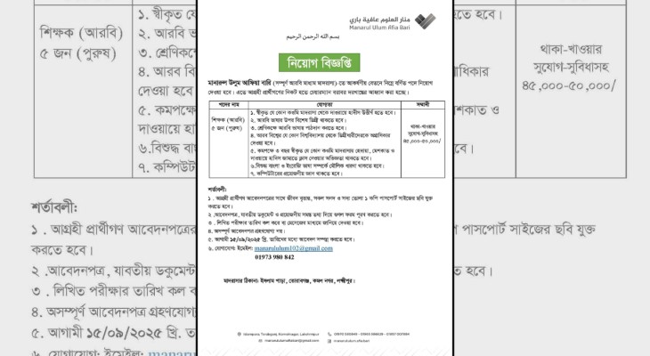 মানারুল উলুম আফিয়া বারি মাদ্রাসার নিয়োগ বিজ্ঞপ্তি