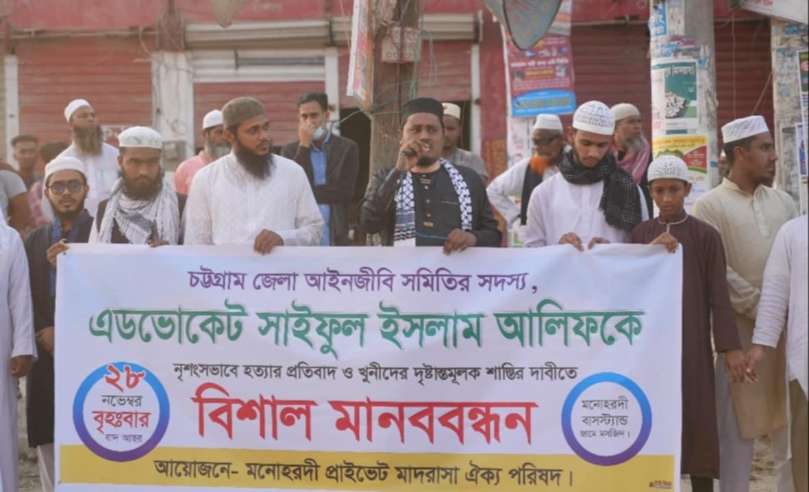 উগ্র হিন্দুত্ববাদীদের সন্ত্রাসী সংগঠন ইসকন কর্তৃক চট্টগ্রাম জেলা আইনজীবী সমিতির সদস্য এডভোকেট শহীদ সাইফুল ইসলাম আলিফকে হত্যার প্রতিবাদে খুনীদের দৃষ্টান্তমূলক শাস্তির দাবিতে মানববন্ধন করেছে 'মনোহরদী প্রাইভেট মাদরাসা ঐক্য পরিষদ'। এতে মাদরাসার শত শত ছাত্র, শিক্ষক, উলামায়ে কেরাম ও সাধারণ বিক্ষুব্ধ জনতা অংশগ্রহণ করেন।