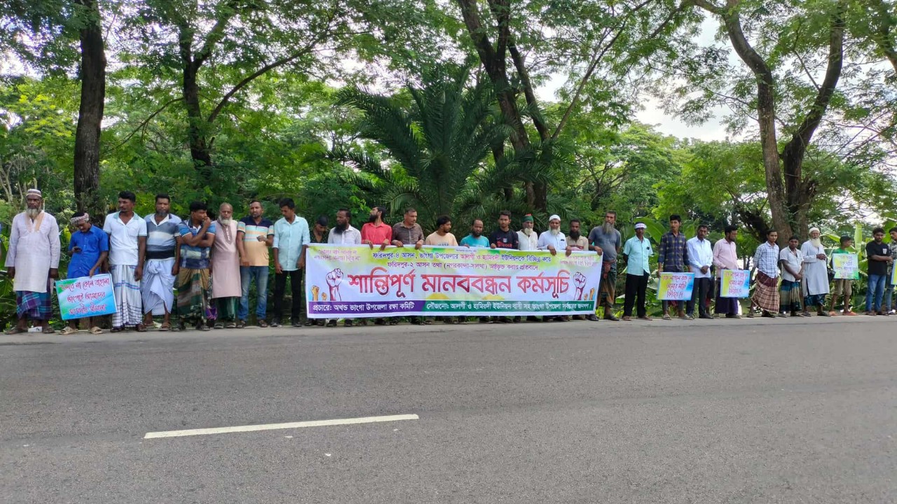 বক্তাগণ আরও বলেন, আমাদের শরীরে এক বিন্দু রক্ত থাকতে আমরা দাবি না মানা পর্যন্ত আমরা শান্তিপূর্ণ মানববন্ধন করে যাবো।