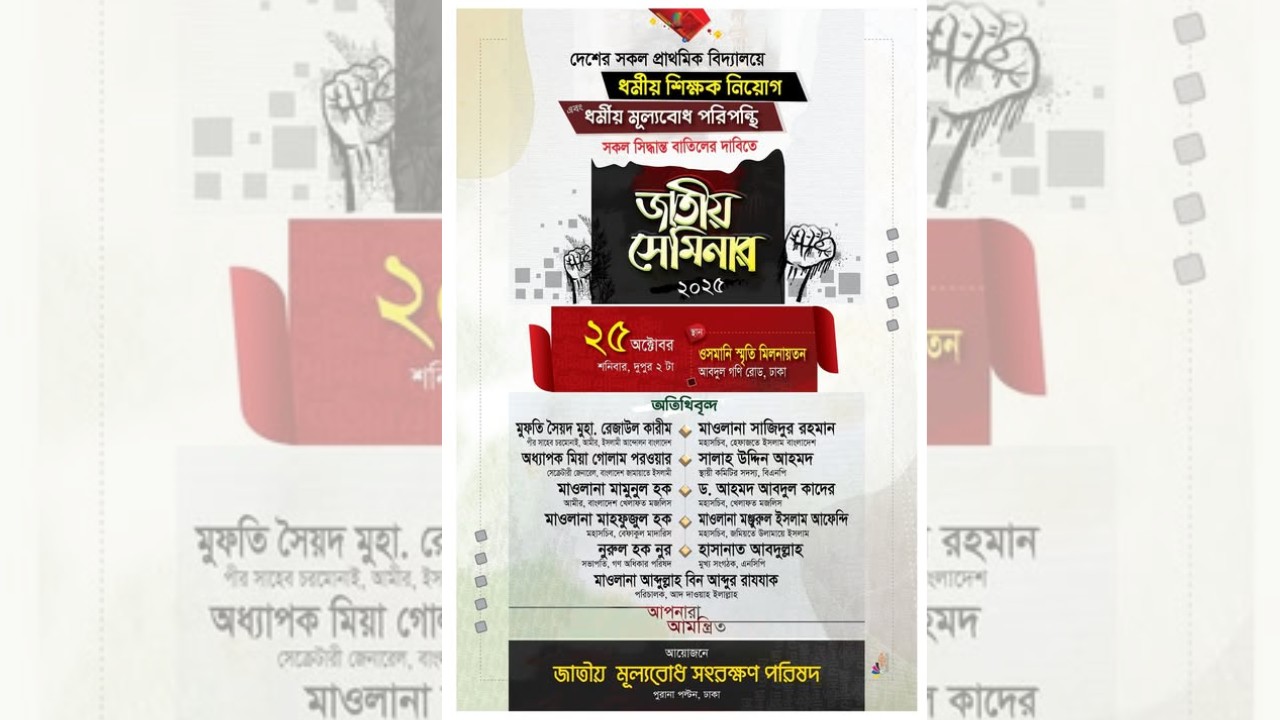 দেশের সকল প্রাথমিক বিদ্যালয়ে ধর্মীয় শিক্ষক নিয়োগ এবং ধর্মীয় মূল্যবোধ পরিপন্থী সকল সিদ্ধান্ত বাতিলের দাবিতে জাতীয় সেমিনারের আয়োজন করেছে জাতীয় মূল্যবোধ সংরক্ষণ পরিষদ।