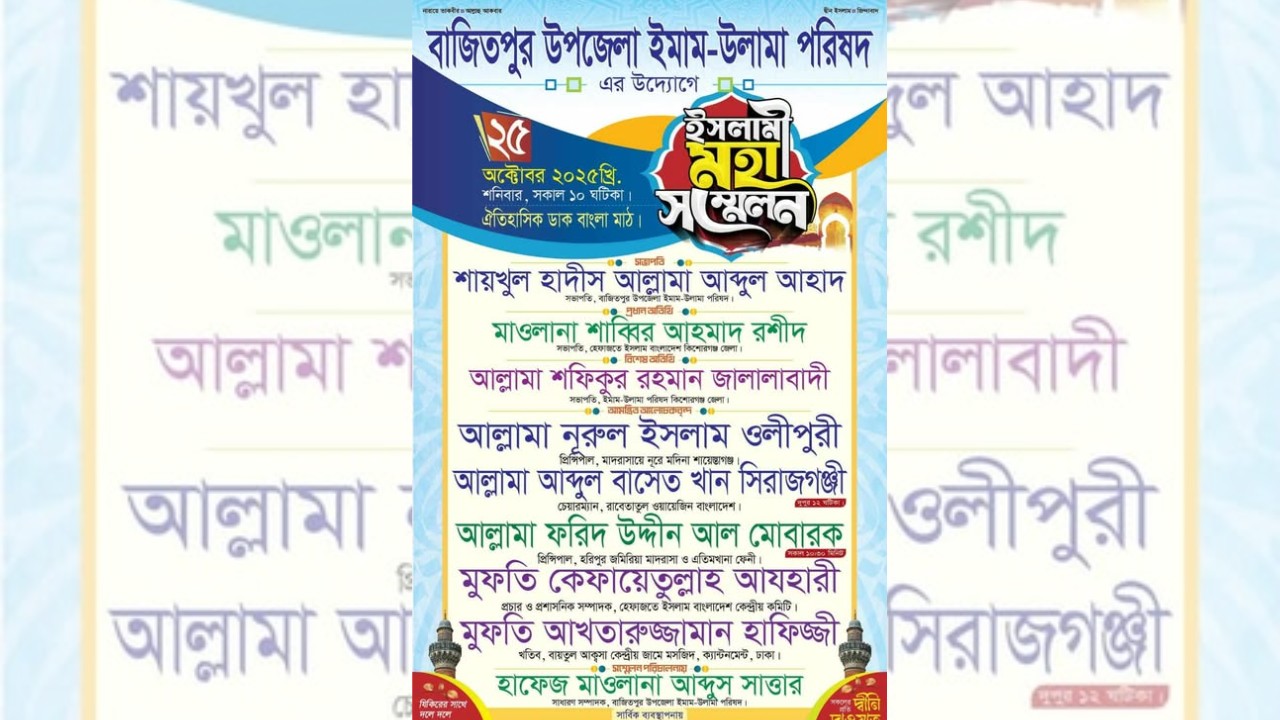 আজ শনিবার (২৫ অক্টোবর) কিশোরগঞ্জের বাজিতপুরের ঐতিহাসিক ডাক বাংলা মাঠে অনুষ্ঠিত হতে ইসলামি মহাসম্মেলন। বাজিতপুর উপজেলা ইমাম-উলামা পরিষদ এই মহাসম্মেলনের আয়োজন করেছে। এতে দেশের বিশিষ্ট ইসলামি চিন্তাবিদ ও দাঈ আল্লামা নূরুল ইসলাম ওলিপুরী (প্রিন্সিপাল, মাদরাসায়ে নূরে মদিনা শায়েস্তাগঞ্জ) শনিবার সকালে অংশ নিচ্ছেন বলে জানা গেছে।