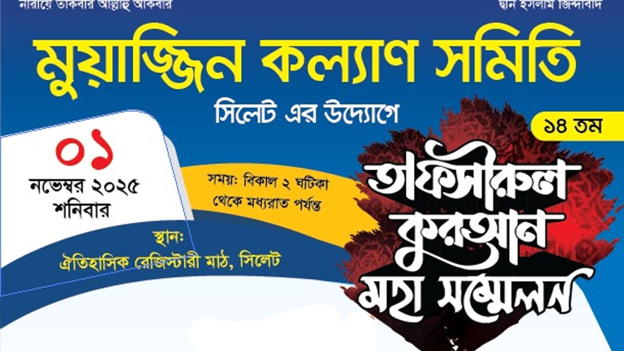 মুয়াজ্জিন কল্যাণ সমিতি সিলেট এর উদ্যোগে ১৪তম বার্ষিক তাফসিরুল কুরআন মহাসম্মেলন আগামী ০১ নভেম্বর শনিবার বিকাল ২টা হতে মধ্যরাত পর্যন্ত ঐতিহাসিক রেজিস্ট্রারী মাঠে অনুষ্ঠিত হবে।