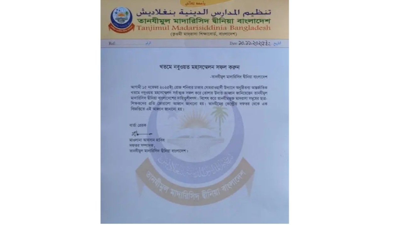 প্রসঙ্গত, আগামী ১৫ নভেম্বর শনিবার ঢাকার ঐতিহাসিক সোহরাওয়ার্দী উদ্যানে সম্মিলিত খতমে নবুওয়ত সংরক্ষণ পরিষদ বাংলাদেশ খতমে নবুওয়ত মহাসম্মেলনের আয়োজন করেছে। এই মহাসম্মেলনে দেশ-বিদেশের বিশিষ্ট আলেমরা অংশ নেবেন। এছাড়া সারাদেশ থেকে তৌহিদি জনতার ঢল নামবে বলে আশা করা হচ্ছে। ইতোমধ্যে এই মহাসম্মেলন সফল করতে ব্যাপক তৎপরতা চলছে।
