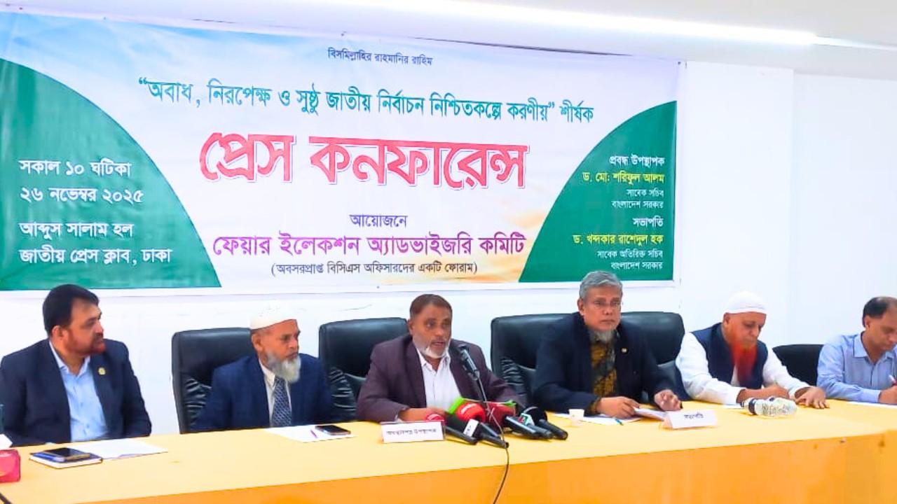 ঢাকা, বুধবার, ২৬ নভেম্বর, ২০২৫: আসন্ন ত্রয়োদশ জাতীয় সংসদ নির্বাচন অবাধ, নিরপেক্ষ ও সুস্ঠু জাতীয় নির্বাচন আয়োজনে নির্বাচন কমিশন ও সংশ্লিষ্টদের সর্বোচ্চ পেশাদারিত্ব ও নৈতিকতা প্রদর্শনের আহ্বান জানিয়েছে ফেয়ার ইলেকশন অ্যাডভাইজরি কমিটি। আজ বুধবার (২৬ নভেম্বর) সকাল ১০ টায় জাতীয় প্রেসক্লাবের আব্দুস সালাম হলে এক সাংবাদিক সম্মেলনে এই আহ্বান জানান তারা।