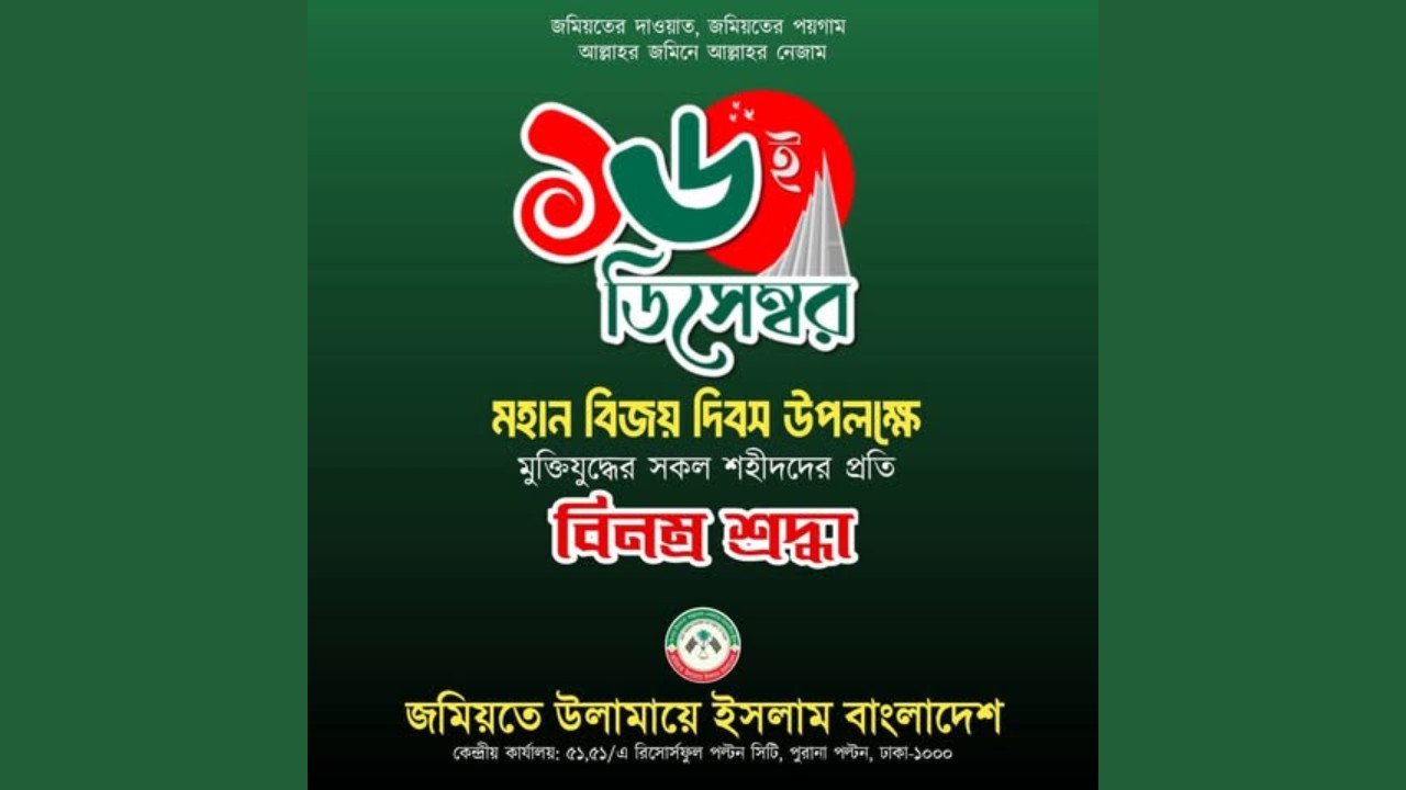 নেতৃদ্বয় আরো বলেন, আমরা শহীদদের রূহের মাগফিরাত কামনা করি এবং বিজয়ের এই দিনে তাদের প্রতি গভীর শ্রদ্ধা নিবেদন করি। একই সঙ্গে আমরা এই স্বাধীন বাংলাদেশে কোরআন-সুন্নাহভিত্তিক ইনসাফপূর্ণ শাসন প্রতিষ্ঠা, দুর্নীতি, বৈষম্য ও জুলুমের অবসান কামনা করি।