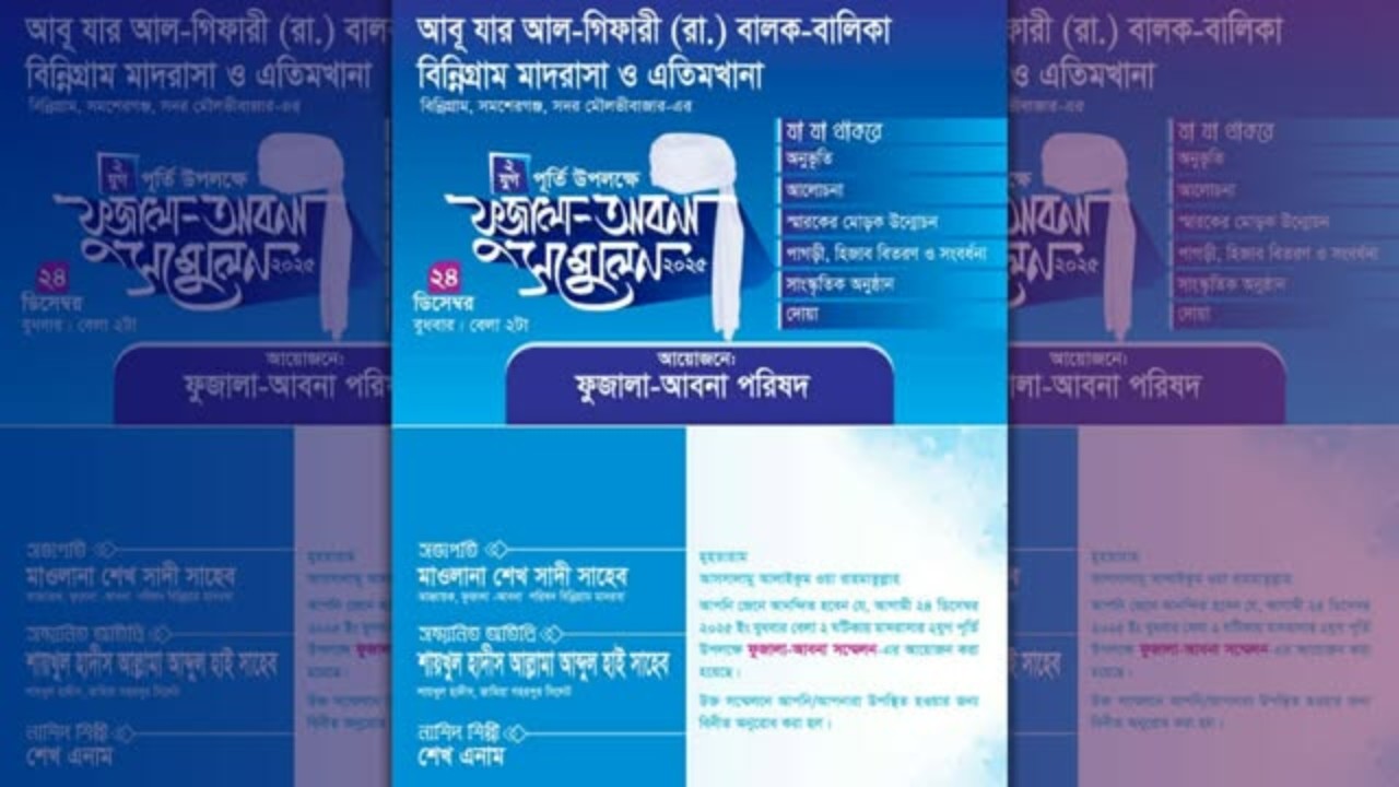 মৌলভীবাজার সদর উপজেলার সমসেরগঞ্জের বিন্নিগ্রাম এলাকায় অবস্থিত আবু যার আল-গিফারী (রহ.) বালক-বালিকা বিন্নিগ্রাম মাদরাসা ও এতিমখানা-এর ২ যুগপূর্তি উপলক্ষে আগামীকাল বুধবার (২৪ ডিসেম্বর) দিনব্যাপী ফুযালা আবনা সম্মেলন অনুষ্ঠিত হবে।