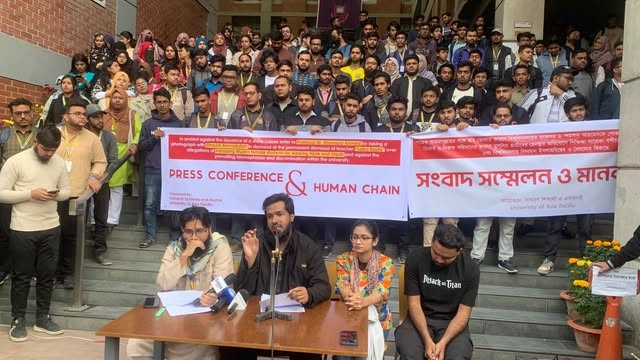 সংবাদ সম্মেলনে শিক্ষার্থীরা জানান, ২০২৫ সালের ২২ আগস্ট জুম্মার নামাজের পর অধ্যাপক ড. শমসাদ আহমেদ কয়েকজন শিক্ষার্থীসহ শায়খ আহমাদুল্লাহর সঙ্গে সাক্ষাৎ করেন এবং একটি গ্রুপ ছবি তোলা হয়। ওই ছবি সামাজিক যোগাযোগমাধ্যমে প্রকাশের পর বিশ্ববিদ্যালয় কর্তৃপক্ষ অধ্যাপককে কারণ দর্শানোর নোটিশ দেয়, যা সরাসরি ধর্মীয় পক্ষপাত ও ইসলামবিদ্বেষের প্রকাশ। কর্তৃপক্ষের এমন আচরণে বিশ্ববিদ্যালয়ে দীর্ঘ দিন ধরে চলে আসা ইসলামবিদ্বেষ আরও স্পষ্ট হয়েছে।