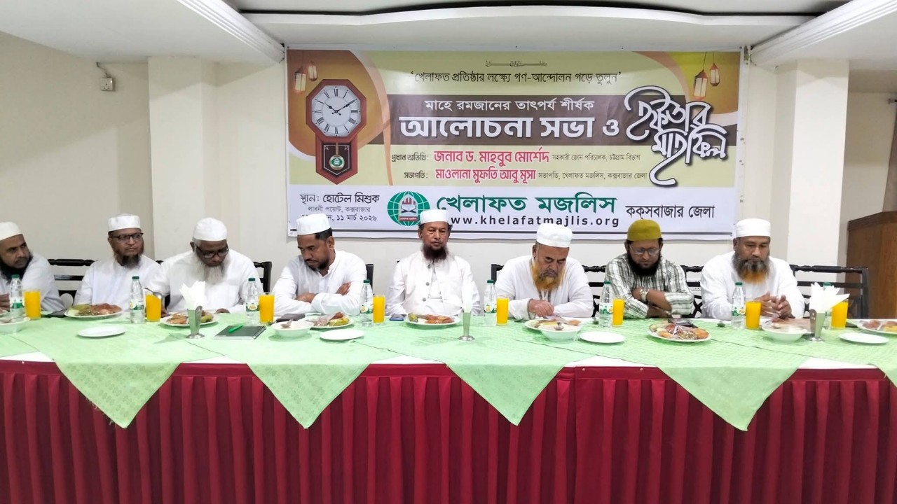 খেলাফত মজলিস কক্সবাজার জেলা শাখার উদ্যোগে ‘মাহে রমজানের তাৎপর্য’ শীর্ষক আলোচনা সভা ও ইফতার মাহফিল বুধবার (১১ মার্চ) কক্সবাজারের ঐতিহ্যবাহী হোটেল মিশুকে অনুষ্ঠিত হয়।