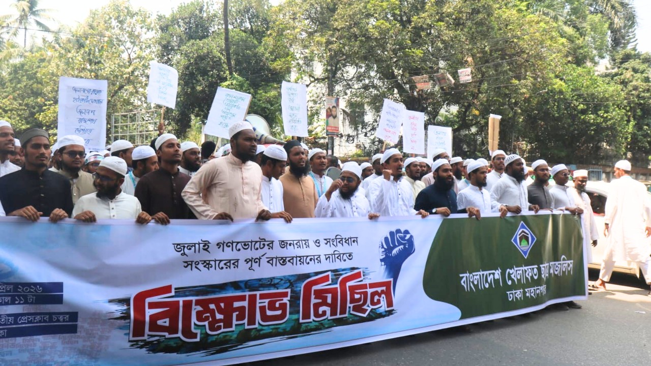 আজ শুক্রবার (১০ এপ্রিল, ২০২৬) সকাল ১১টা থেকে জাতীয় প্রেসক্লাব চত্বরে বাংলাদেশ খেলাফত ছাত্র মজলিস ঢাকা মহানগরীর উদ্যোগে ‘জুলাই গণভোটের জনরায় ও সংবিধান সংস্কারের পূর্ণ বাস্তবায়ন’ দাবিতে বিক্ষোভ সমাবেশ ও মিছিল অনুষ্ঠিত হয়েছে।