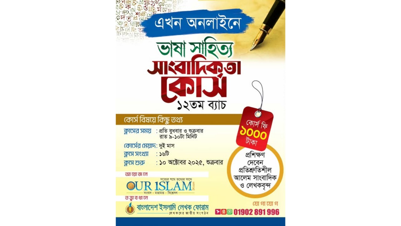 যারা দেশ-বিদেশ থেকে ভাষা সাহিত্য ও সাংবাদিকতা কোর্সে অংশ নিতে চান তাদের সামনে বড় সুযোগ এনে দিয়েছে অনলাইন নিউজপোর্টাল আওয়ার ইসলাম ও বাংলাদেশ ইসলামি লেখক ফোরাম। প্রতিশ্রুতিশীল আলেম, সাংবাদিক ও লেখক প্রশিক্ষকদের তত্ত্বাবধানে শুরু হচ্ছে ‘ভাষা সাহিত্য সাংবাদিকতা কোর্স’ (১২তম ব্যাচ)।