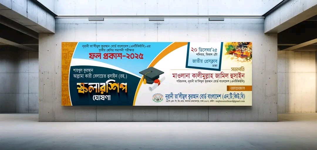 নূরানী তালিমুল কোরআন বোর্ড বাংলাদেশ (এনটিকিউবি)-এর অধীনে পরিচালিত তৃতীয় শ্রেণির ১৯তম কেন্দ্রীয় সমাপনী পরীক্ষার ফলাফল আজ শনিবার (২০ ডিসেম্বর) প্রকাশ করা হবে। একই সঙ্গে তরুণদের জন্য ‘শায়খুল কোরআন আল্লামা কারী বেলায়েত হুসাইন (রহ.) স্কলারশিপ’-এরও ঘোষণা দেওয়া হবে।