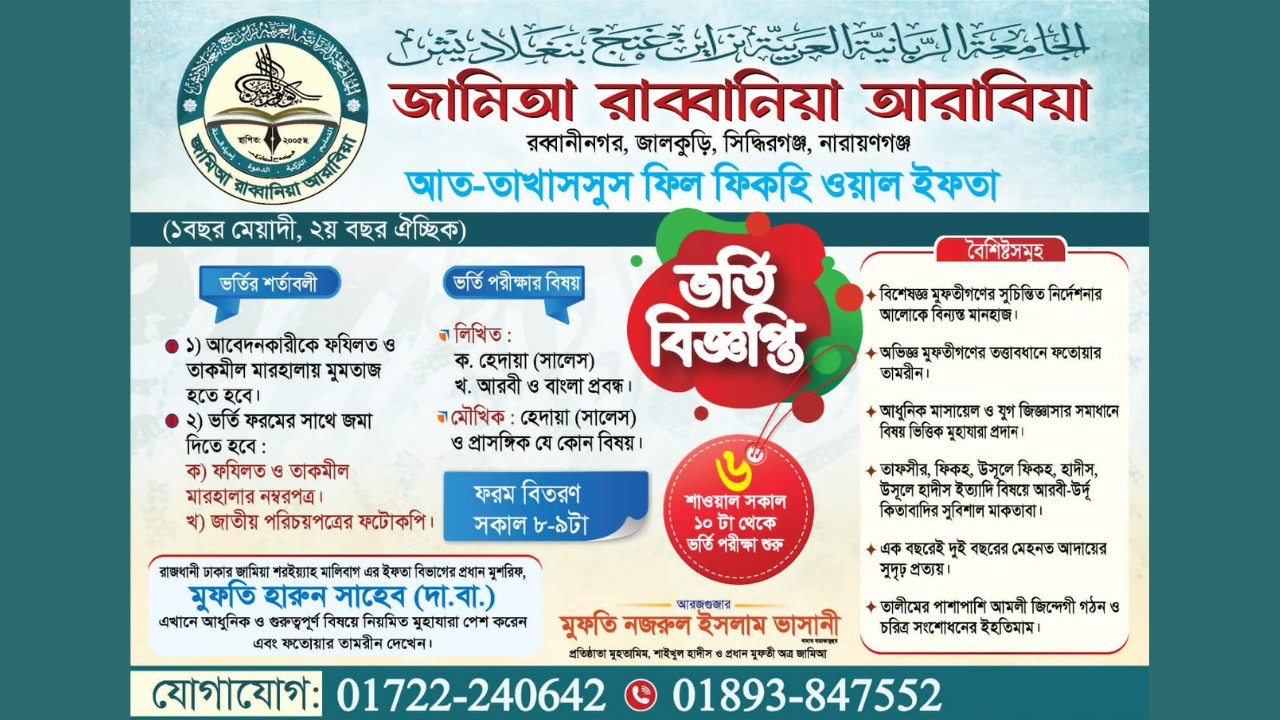 প্রতিষ্ঠানটির প্রতিষ্ঠাতা মুহতামিম, প্রধান মুফতী ও শাইখুল হাদীস মুফতী নজরুল ইসলাম ভাসানী জানান, আমাদের উচ্চতর বিভাগ আত-তাখাসসুস ফিল ফিকহি ওয়াল ইফতা কোর্সে আগামী (২০২৬-২৭ ইং) শিক্ষা বছরের জন্য ১ বছর মেয়াদী (২য় বছর ঐচ্ছিক) ভর্তি শুরু হবে ৬ ই শাওয়াল ১৪৪৭ হিজরী সকালে।