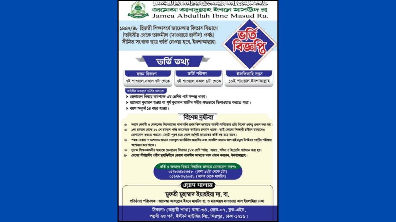 প্রতিষ্ঠানটির প্রতিষ্ঠাতা মুহতামিম ও দেশের প্রখ্যাত আলেম মুফতী মুহাম্মাদ ইয়াহইয়া জানান, আমাদের জামেআ আবদুল্লাহ ইবনে মাসউদ রা.-এ (১৪৪৭-৪৮) হিজরি শিক্ষাবর্ষে জামেআর কিতাব বিভাগে সীমিত সংখ্যক ছাত্র ভর্তি নেওয়া হবে, ইনশাআল্লাহ।