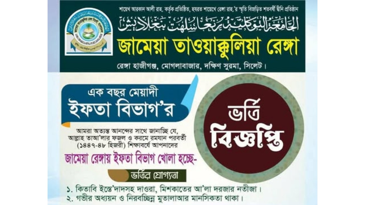 সিলেটের দক্ষিণ সুরমার মোগলাবাজারে অবস্থিত শতবর্ষী দ্বীনি বিদ্যাপীঠ জামেয়া তাওয়াক্কুলিয়া রেঙ্গা এক ঐতিহাসিক ও যুগান্তকারী পদক্ষেপ গ্রহণ করেছে। দীর্ঘ প্রতিক্ষার অবসান ঘটিয়ে আগামী ১৪৪৭-৪৮ হিজরি শিক্ষাবর্ষ থেকে জামেয়ায় উচ্চতর ইসলামি ফিকহ ও ফাতওয়া গবেষণা বিভাগ তথা ‘ইফতা বিভাগ’ চালু করার আনুষ্ঠানিক ঘোষণা দেওয়া হয়েছে।