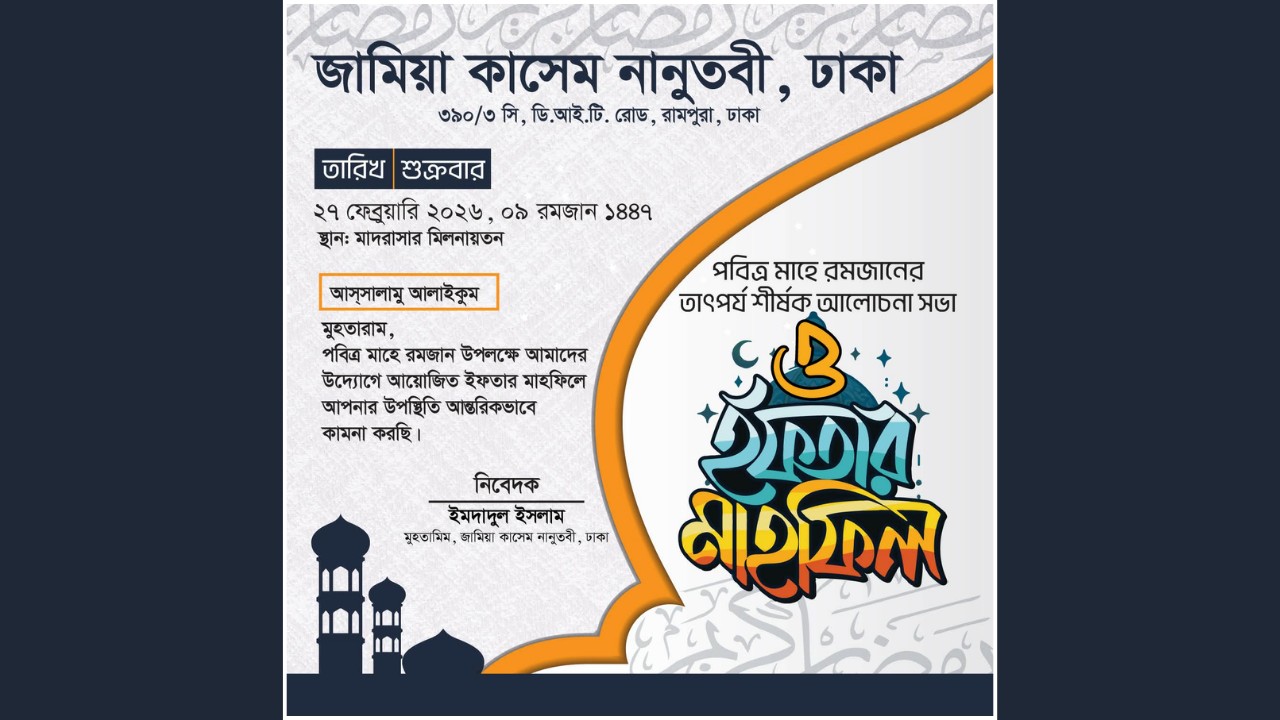 পবিত্র মাহে রমজানের তাৎপর্য শীর্ষক আলোচনা সভা ও ইফতার মাহফিলের আয়োজন করেছে রাজধানীর স্বনামধন্য প্রতিষ্ঠান জামিয়া কাসেম নানুতবী ঢাকা। গুরুত্বপূর্ণ এ আলোচনা সভায় সকলের উপস্থিতি কামনা করেছেন প্রতিষ্ঠানটির মুহতামিম মুফতি ইমদাদুল ইসলাম।