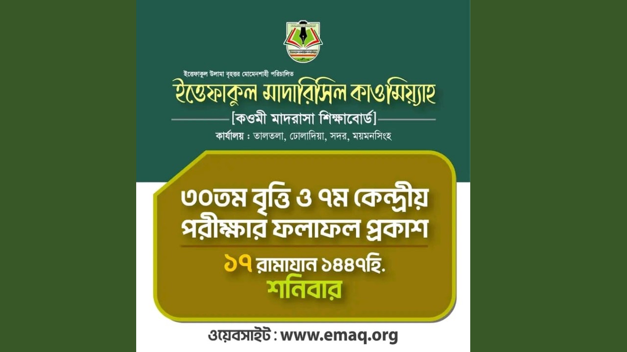 ইত্তেফাকুল উলামা বৃহত্তর মোমেনশাহী পরিচালিত ইত্তেফাকুল মাদারিসিল (কওমি আঞ্চলিক শিক্ষা বোর্ড) কওমিয়ার ৩০তম বৃত্তি ও সপ্তম কেন্দ্রীয় পরীক্ষার ফলাফল আগামী ১৭ রমজান শনিবার (৭ মার্চ) প্রকাশিত হবে।