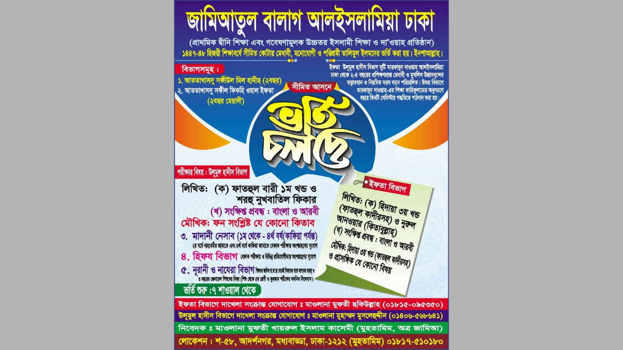 সীমিত আসনে ইফতা, উলুমিল হাদিসসহ অন্যান্য বিভাগে ভর্তি নিচ্ছে রাজধানী বাড্ডার প্রাথমিক দ্বীনি শিক্ষা ও গবেষণামুলক উচ্চতর ইসলামী শিক্ষা-দা'ওয়াহ প্রতিষ্ঠান জামিআতুল বালাগ আলইসলামিয়া ঢাকা।