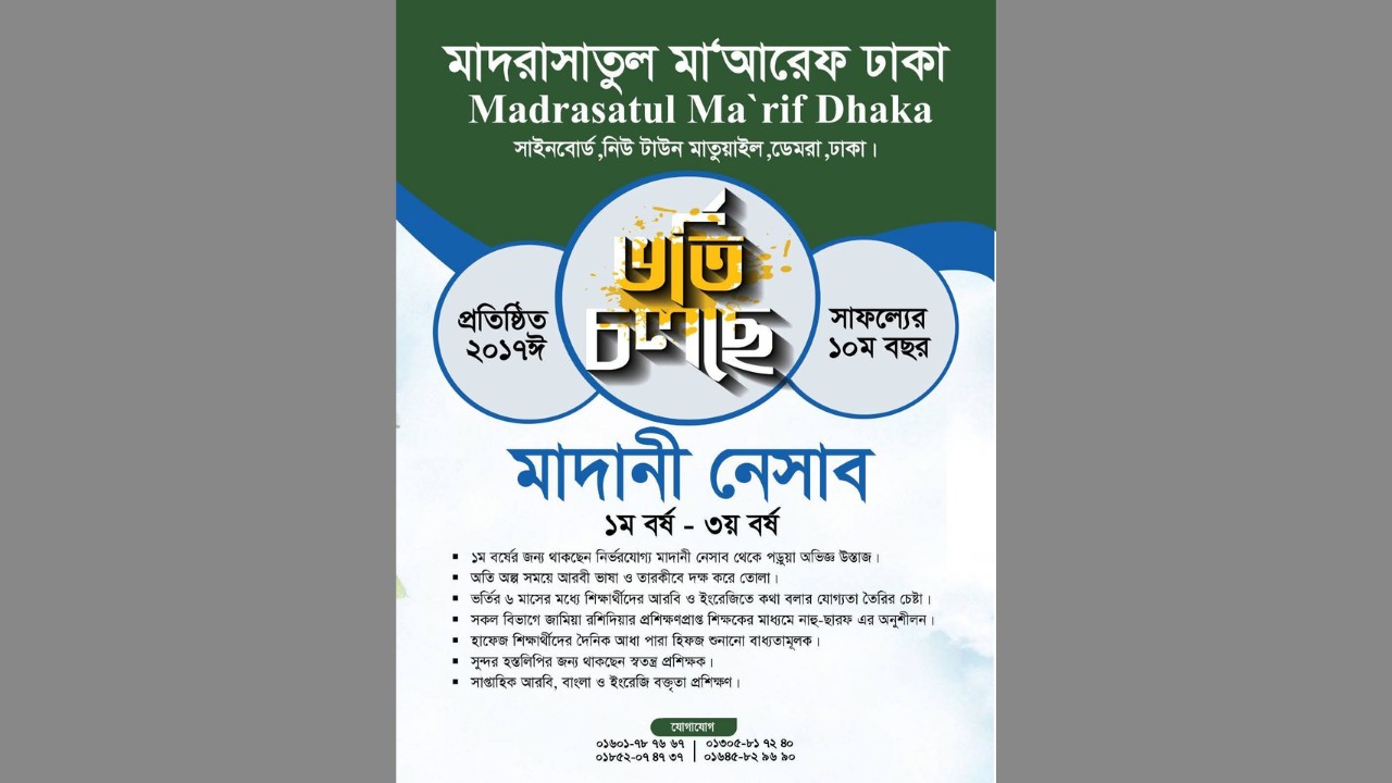 মাদানী নেসাব ও আরবি ভাষা-সাহিত্য (আদব) বিভাগে ভর্তি নেবে মাদরাসাতুল মাআরেফ ঢাকা। প্রতিষ্ঠানটি ইতোমধ্যে সাফল্যের সঙ্গে দশম বছর পাড়ি দিয়েছে। এখানে আরবি আদব বিভাগের মুশরিফ হিসেবে নিয়মিত দরস দেবেন মাহাদুস সাকাফা বাংলাদেশের প্রতিষ্ঠাতা পরিচালক, বহু গ্রন্থ প্রণেতা আরবি ভাষাবিদ ও সাহিত্যিক মাওলানা আশরাফ আলম কাসেমী নদভী।